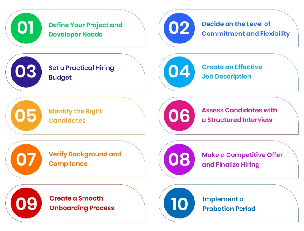 Hiring a developer is an important decision and shouldn’t be rushed. These 10 steps will help you go from understanding your project needs to bringing the right developer on board. Following them carefully can make the whole process faster and less stressful for your team.